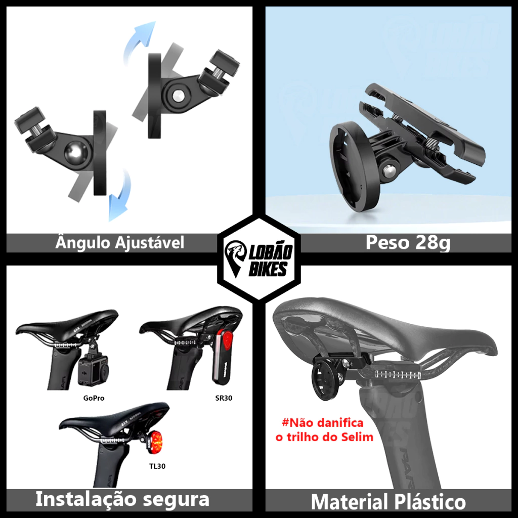 O M30 é um adaptador para suporte feito em plástico de alta qualidade, permitindo uma excelente fixação no selim, facilitando a instalação dos acessórios compatíveis. O M30 é compatível com TL30, SR30, GoPro, Garmin Varia, etc.... Permitindo uma excelente fixação. CONTEÚDO DA EMBALAGEM: 1 M30 suporte para TL30, SR30, GoPro, Garmin Varia, etc.....